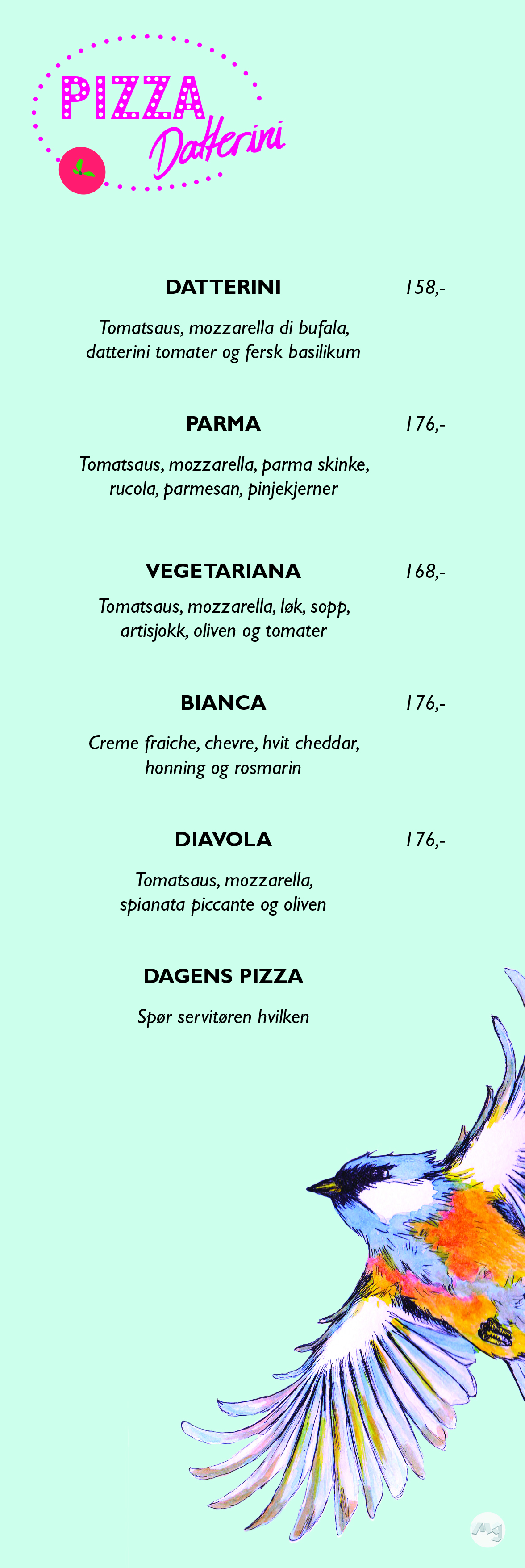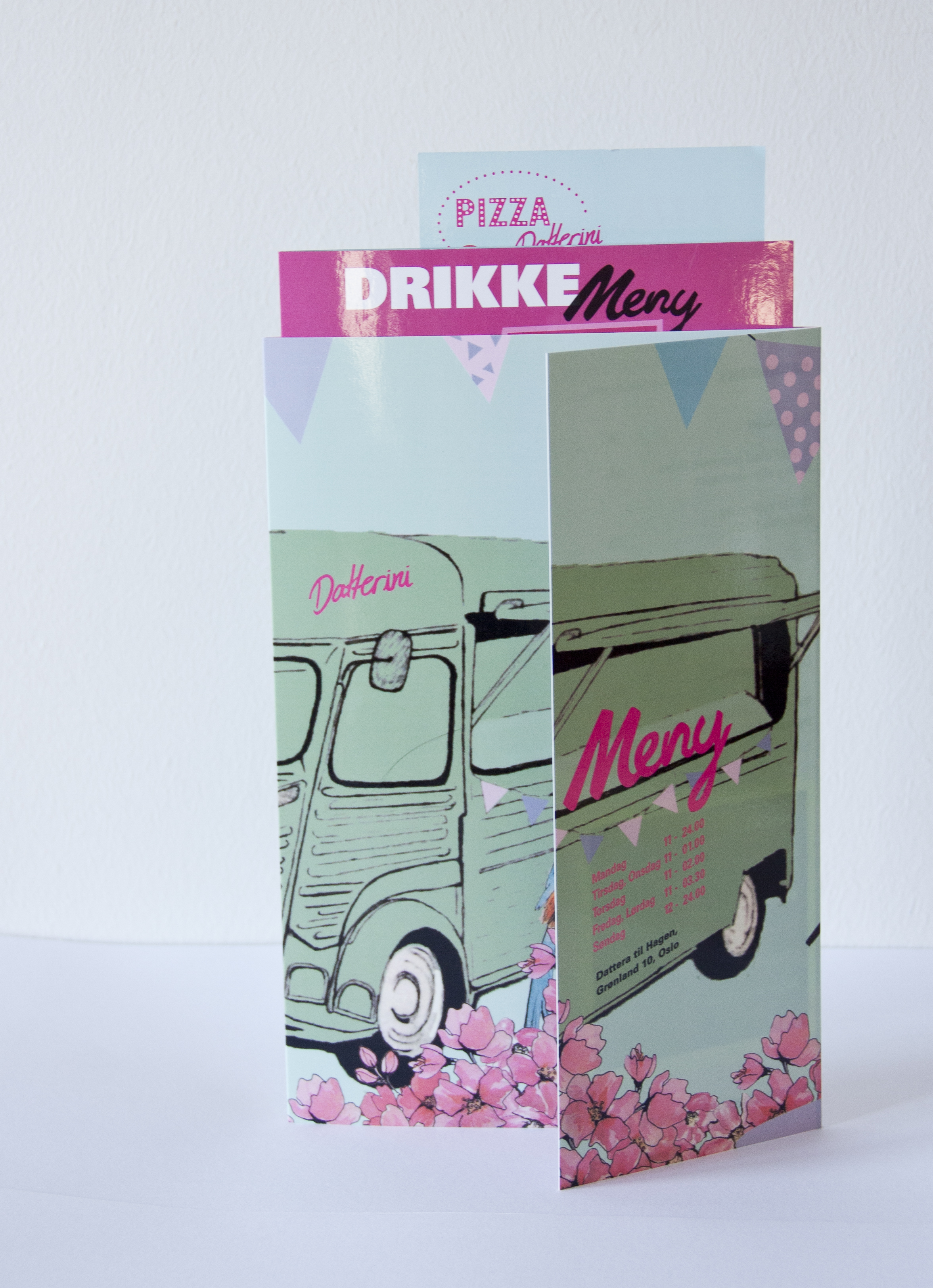 Denne gangen åpnet de en pizzabil som selger pizza. Det var behov om å kunne ha ulike menyer til forskjellige bruk. Derfor laget jeg 3 ulike menyer som kan fungere sammen.